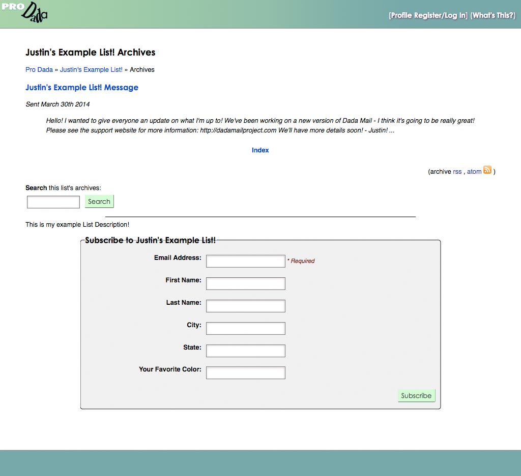 Individual archived messages will have their own screen, with a search form, to search through the mailing list's archived messages and a Dada Mail Subscription Form, so your users can send each other copies of the archived messages.