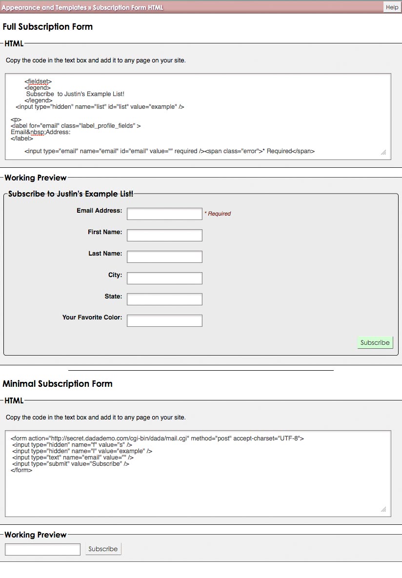 The Dada Mail Subscription Form is the HTML code that you'll need to put a subscription form on any page of your web site. It can be copied from the, Appearance and Templates - Subscription Form HTML screen.