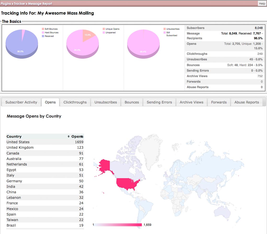 The Tracker plugin creates analytic reports based on data collected about your mass mailings: things like messages opens, clickthroughs, bounces, forwards, archive views, etc.