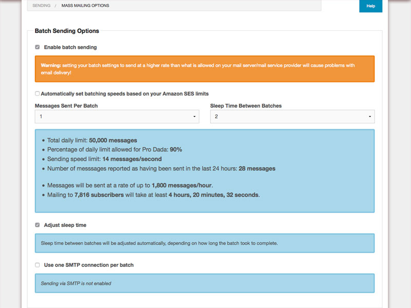 - Mass Mailing supports batch sending: send # messages per hour, auto batch settings are supported for Amazon SES, which dynamically adjust according to your current SES sending limits.