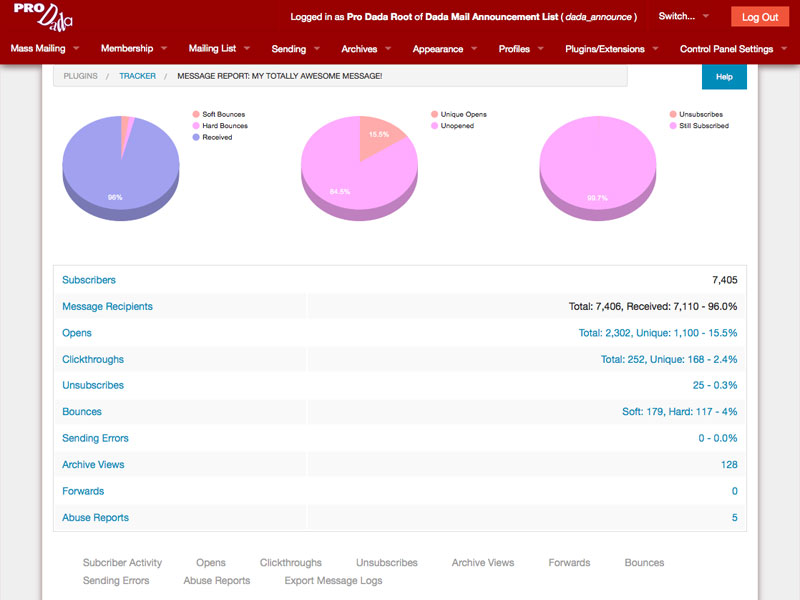 Let Dada Mail automatically create reports for each mass mailing you send out, including: Number of Subscribers, URL Clickthroughs, Message Opens, Archive Views, Forwards, and Bounces